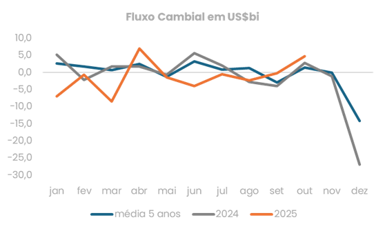 O ponto-chave está em entender que a dinâmica do câmbio não se resume ao comportamento pontual de dezembro. O que realmente define o rumo do dólar nos meses seguintes é o conjunto de fundamentos macroeconômicos: trajetórias dos juros no Brasil e nos Estados Unidos, credibilidade fiscal, fluxo de investimentos diretos, expectativas de crescimento e cenários geopolíticos. Se o Banco Central Brasileiro mantiver uma política monetária capaz de atrair capital estrangeiro — por meio de juros reais competitivos — e se o governo apresentar sinalizações claras de responsabilidade fiscal, o país tende a recuperar parte do fluxo de dólares já no início do ano seguinte. Por outro lado, incertezas internas ou um cenário externo mais avesso ao risco podem prolongar o período de pressão cambial. Neste sentido, acredito que não estamos nem lá, nem cá. Embora o juro real brasileiro seja de fato atrativo, nos falta sinalizações sobre o futuro das contas fiscais, ou melhor, as sinalizações que temos não são das melhores, oque contribui para adicionar volatilidade a esse cenário.