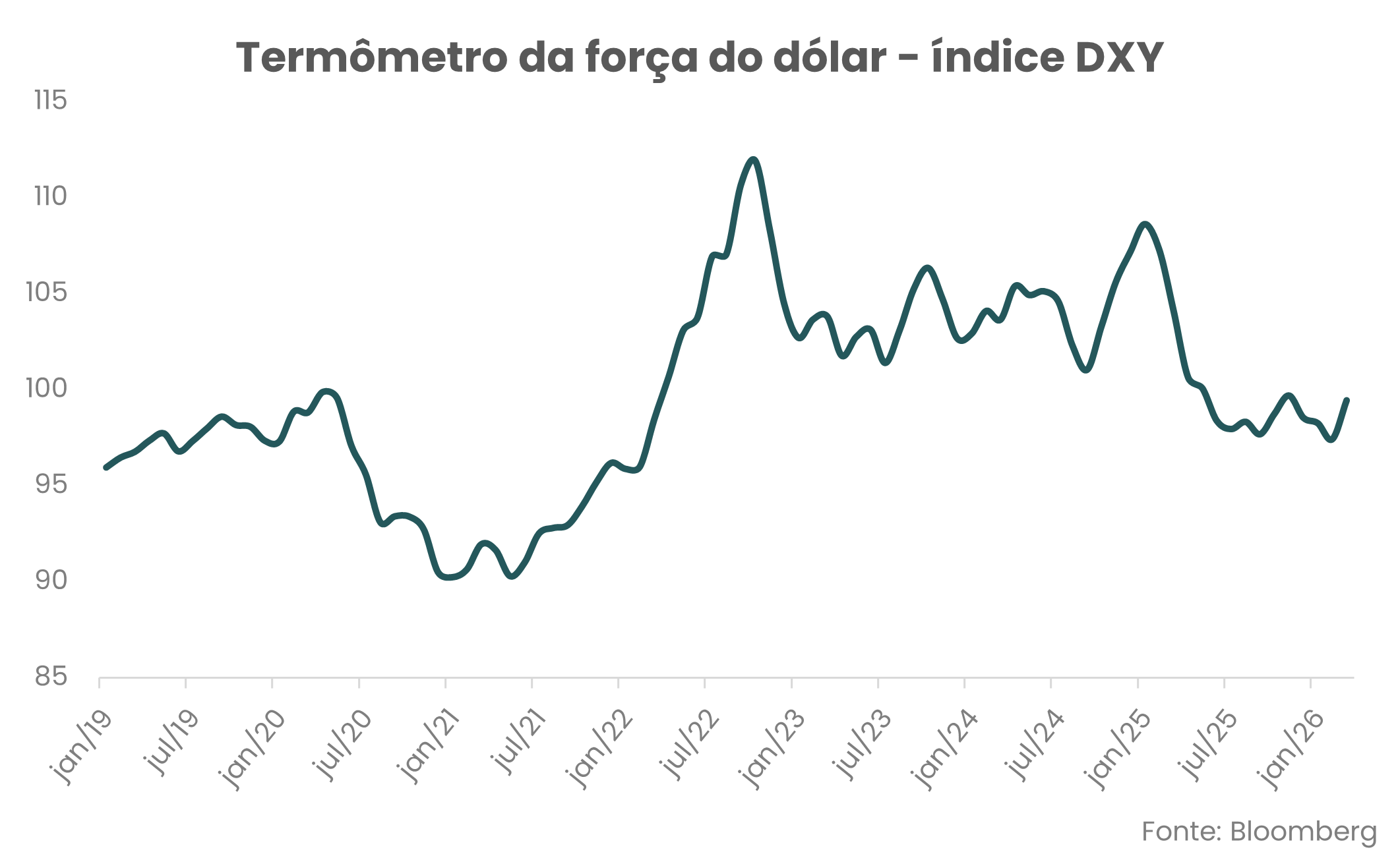 O epicentro da turbulência geopolítica está no Oriente Médio, onde o conflito entre EUA e Irã — iniciado em fevereiro - segue sem resolução clara. Recentemente, o presidente dos EUA estendeu o cessar-fogo aguardando uma proposta unificada do governo iraniano, mas manteve o bloqueio naval aos portos do país. Teerã, por sua vez, se recusa a negociar sob ameaças e classifica o bloqueio como violação da trégua. O impacto nos mercados é profundo: especialistas alertam para o fato de que levaria mais de dois anos para a produção de petróleo voltar à normalidade, mesmo que a Guerra terminasse hoje. Na taxa de câmbio, o conflito produziu um efeito paradoxal — em vez de fortalecer o dólar como ativo refúgio, a combinação de Guerra prolongada, política tarifária de Trump e perda de credibilidade americana como âncora da ordem global fez o índice DXY recuar para cerca de 99 pontos, abaixo dos picos observados ao longo de 2025 (ver gráfico). Lembrando que o DXY é um termômetro que mede se o dólar está forte ou fraco em relação a outras moedas do mundo — quanto mais alto o número, mais valorizado está o dólar.