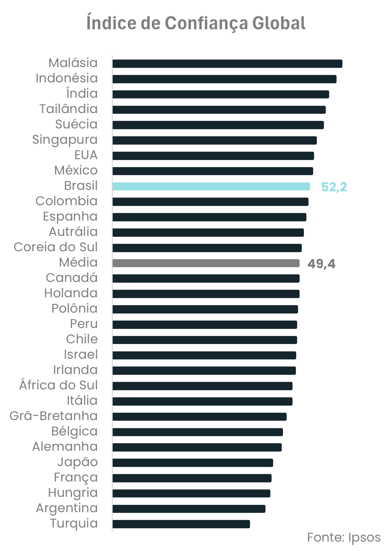 Na Europa, por exemplo, a expectativa de baixo crescimento convive com as cicatrizes de anos de conflito e o desafio de reorientar cadeias produtivas numa ordem econômica global em reconfiguração, como bem sinalizou o FMI em seu último relatório trimestral. Adicionalmente, vale destacar que em algumas economias os índices de confiança permanecem ainda não retomaram os patamares pré-pandemia, e a incerteza geopolítica adiciona uma nova camada de cautela sobre consumidores e investidores. Vale destacar um dado promissor no plano comparativo internacional, o ICC, da Ipsos, que avançou para 52,2 pontos em março de 2026, colocando o Brasil praticamente na liderança das Américas e na nona posição global, acima da média mundial e à frente de economias como da Espanha e Colômbia (ver gráfico).