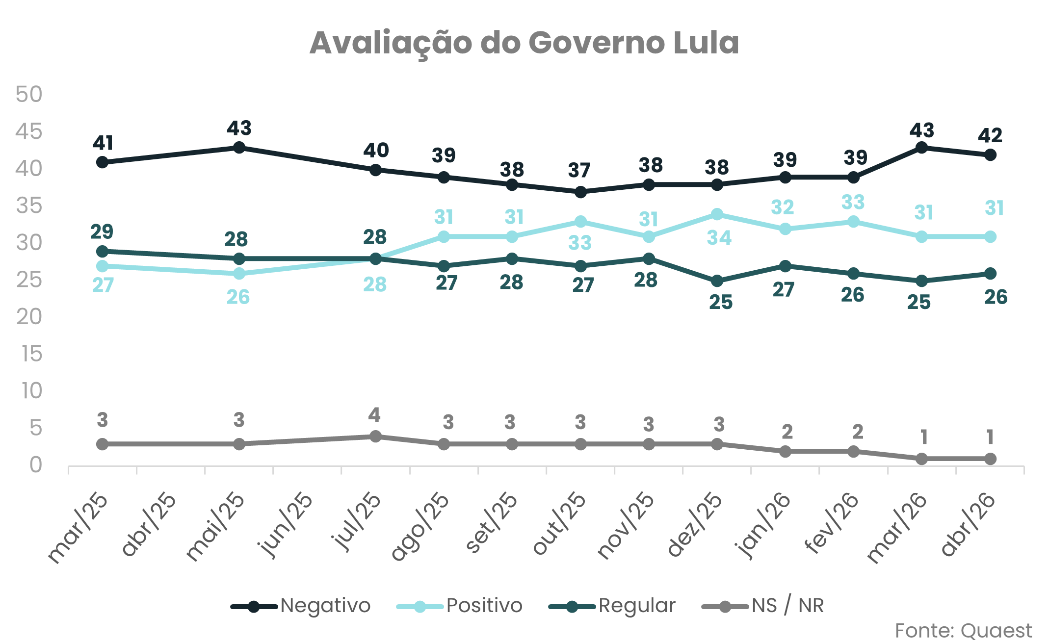 Nenhuma análise de confiança no Brasil de 2026 estaria completa sem enfrentar o elefante na sala: as eleições presidenciais de outubro. O atual presidente, Lula, segue liderando as pesquisas, mas com níveis de aprovação relativamente contidos (ver gráfico) — um sinal de que a liderança é, possivelmente, mais produto da fragmentação da oposição do que de uma popularidade sólida. Do outro lado, a incerteza que marcava a oposição deu lugar a um quadro mais definido com Flávio Bolsonaro consolidando-se como o nome da direita, com elevada transferência do capital político do bolsonarismo e avanço consistente nas pesquisas recentes. Para os mercados, a mudança é relevante: a definição de um candidato competitivo de direita diminui parte da incerteza institucional associada à ausência de liderança, mas não elimina o risco. Pelo contrário, ao tornar o resultado mais disputado, o cenário continua a justificar prêmios de riscos mais elevados — não pela falta de nomes, mas pela maior imprevisibilidade do desfecho eleitoral.