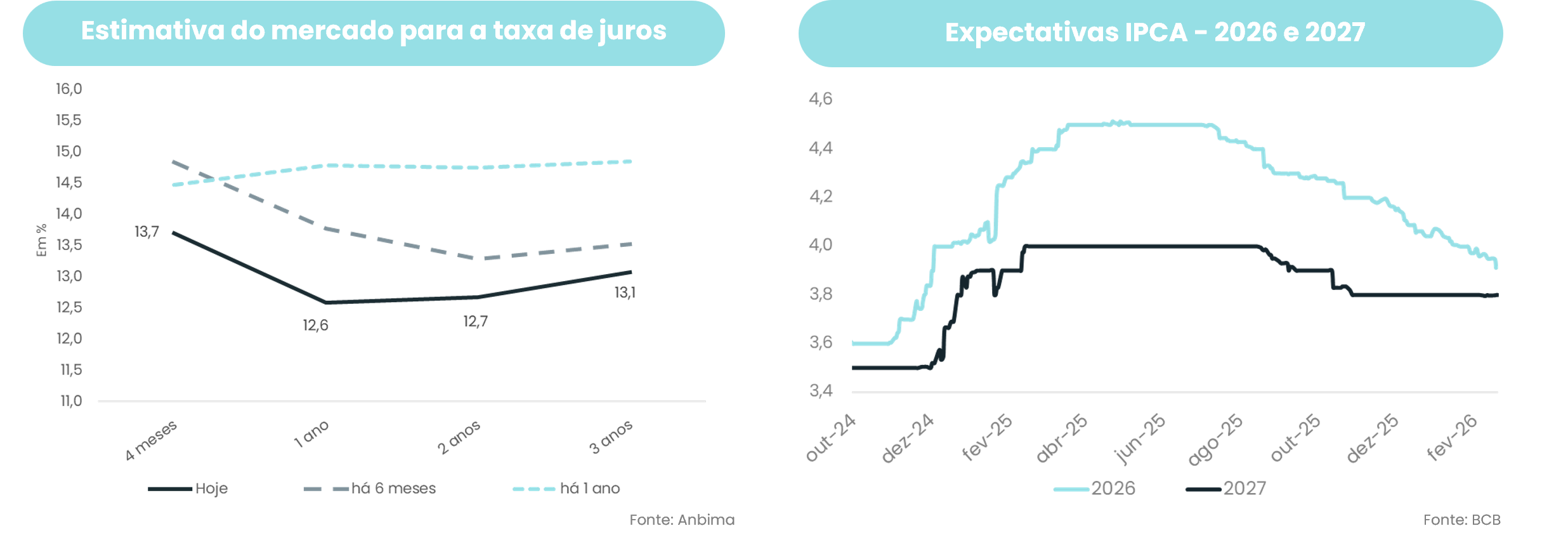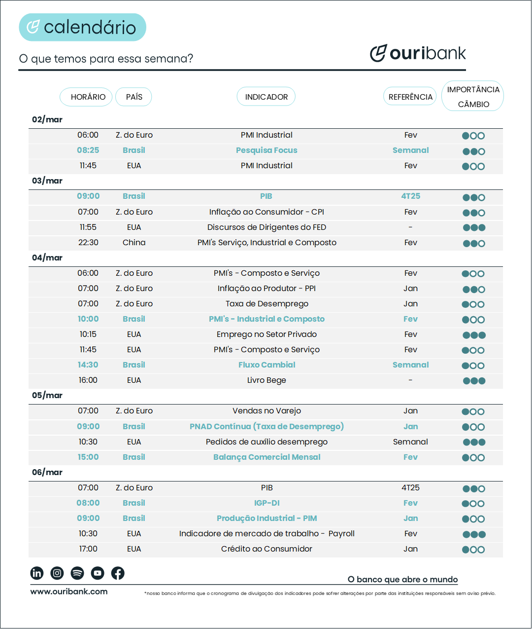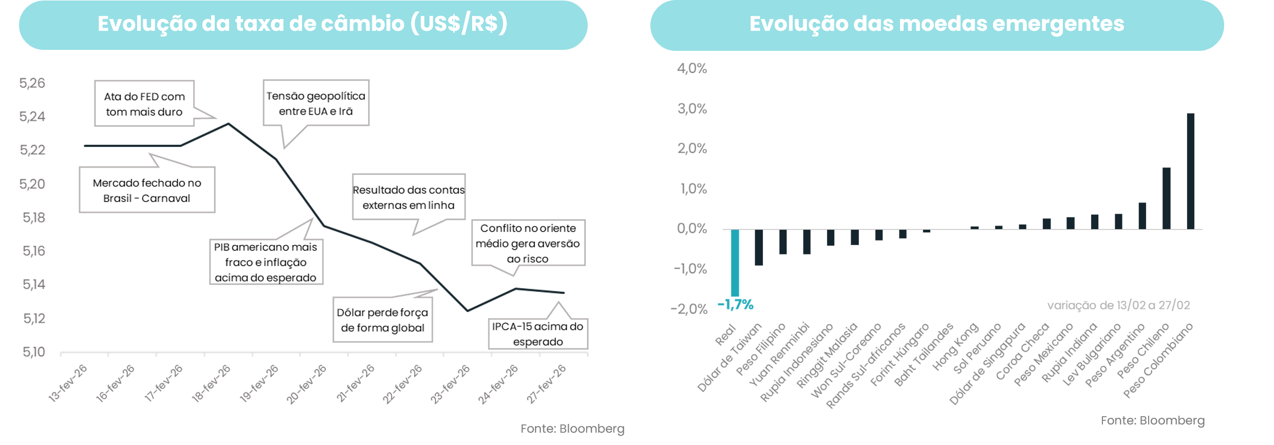 Nossa taxa de câmbio continua sendo destaque positivo entre as demais moedas emergentes, impulsionado pelo diferencial de juros - que sustenta o ingresso de fluxo de capital especulativo para ativos brasileiros e entradas de capital estrangeiro. Além disso, a aversão ao risco global devido a incertezas sobre os desdobramentos geopolíticos entre EUA e Irã e a evolução das tarifas americanas, contribuíram para que a redução da atratividade do dólar. Ainda é cedo para afirmar que esse movimento é tendência, afinal, estamos ainda no fim de fevereiro e logo menos entraremos em período eleitoral no Brasil, o que tende a trazer pressão e volatilidade para nossa taxa de câmbio.