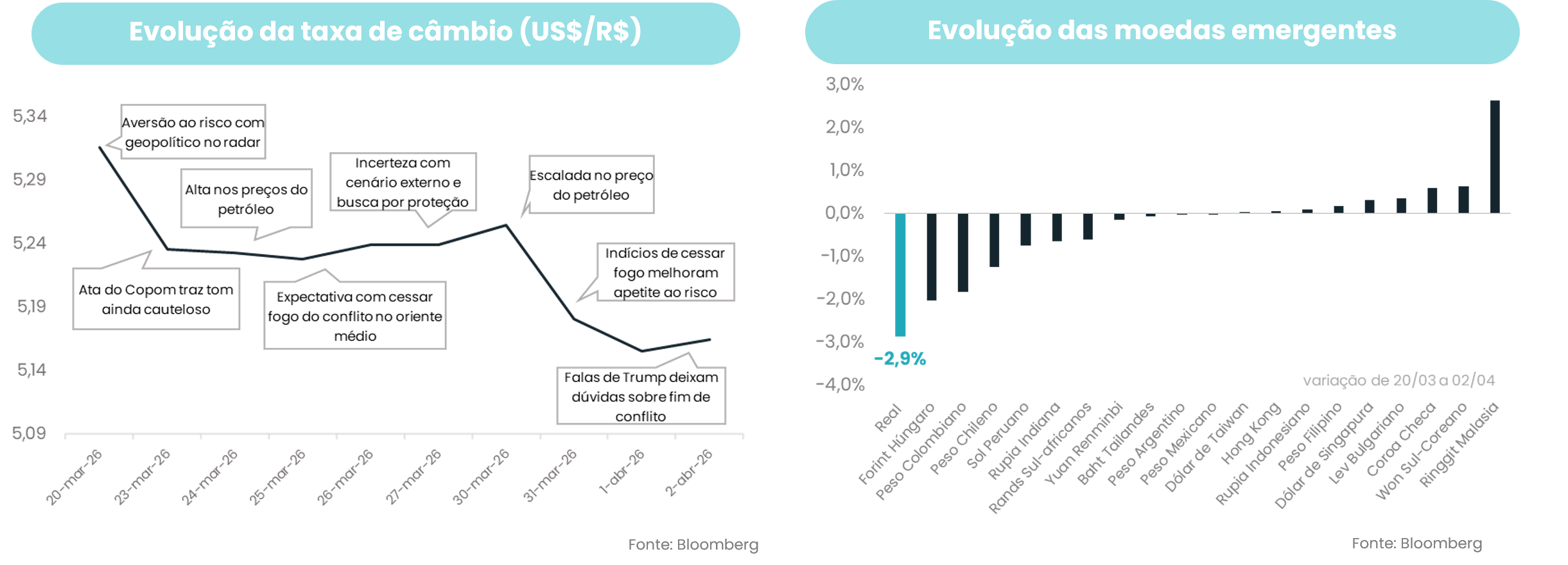 Em uma semana mais curta, por conta do feriado, o real voltou a se destacar diante dos pares emergentes. Observou-se uma melhora no apetite ao risco global, após sinalizações de que o conflito entre Irã e EUA estaria chegando ao fim e isso contribuiu para uma melhor evolução dos ativos, mas, principalmente, para a valorização de algumas moedas emergentes. Além disso, o Brasil continua se beneficiando do ingresso de fluxo de capital especulativo por conta da taxa de juros elevada. A questão que fica agora é se o confito está próximo mesmo de terminar ou não. Enquanto houver conflito, haverá volatilidade.
