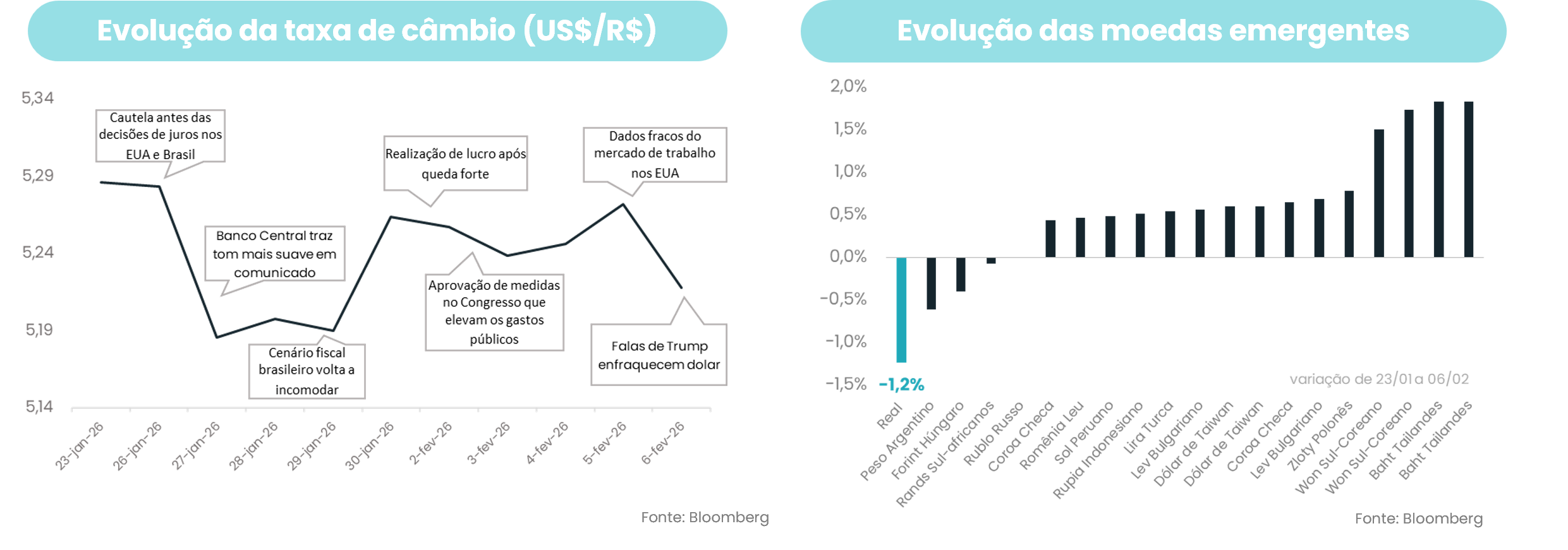 Nossa taxa de câmbio apresentou relativa estabilidade ao longo dos últimos dias, após valorização mais expressiva observada em janeiro. Apesar de alguma volatilidade pontual, o real segue sustentado pela atratividade do diferencial de juros, uma vez que a taxa Selic permanece em patamar elevado -contribuindo para manter o fluxo estrangeiro direcionado ao país. Ainda assim, o comportamento recente tem sido bastante influenciado pelo cenário externo e pela dinâmica do dólar global, que sugere cautela diante das incertezas relacionadas à política monetária internacional e à evolução do ambiente fiscal doméstico.