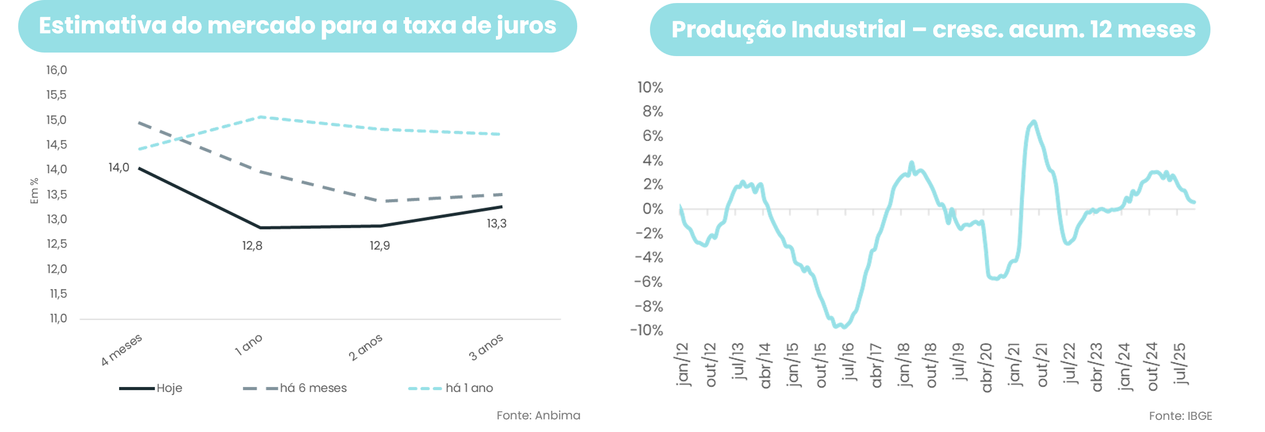 A curva de juros doméstica também apresentou acomodação recente, em linha com a melhora das expectativas de inflação e com a sinalização do Banco Central de que o início do ciclo de corte da Selic poderá ocorrer na próxima reunião. Atualmente, a taxa básica permanece em 15% a.a., o que mantém a política monetária em território contracionista. Esse contexto tem favorecido a redução dos prêmios de risco ao longo da curva, ainda que as taxas permaneçam em níveis elevados em termos históricos. Dessa forma, o cenário segue compatível com um processo de flexibilização monetária gradual e cauteloso, refletindo o compromisso da autoridade monetária com a consolidação da trajetória desinflacionária e a ancoragem das expectativas no médio prazo.