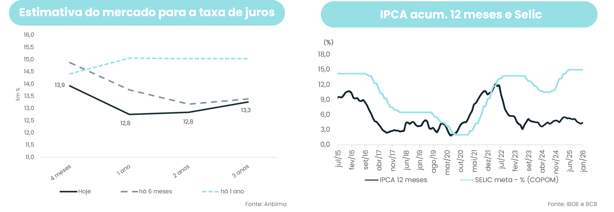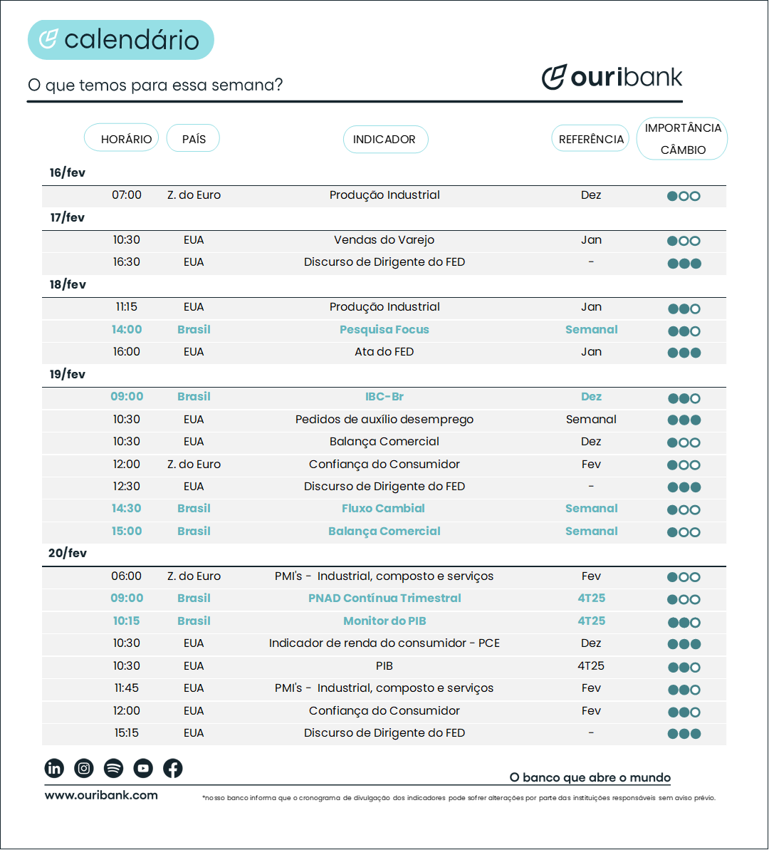 Já a curva de juros apresentou acomodação ao longo da semana, com recuo das taxas futuras e redução da inclinação, refletindo a consolidação das expectativas de início do ciclo de cortes da Selic a partir de março e a percepção de que a política monetária permanece suficientemente restritiva. As taxas de DI recuaram após sinalizações do Banco Central consideradas mais suaves e diante de um ambiente de inflação mais controlada, reforçando a precificação de flexibilização gradual ao longo de 2026. A curva de juros reflete exatamente esse ambiente.