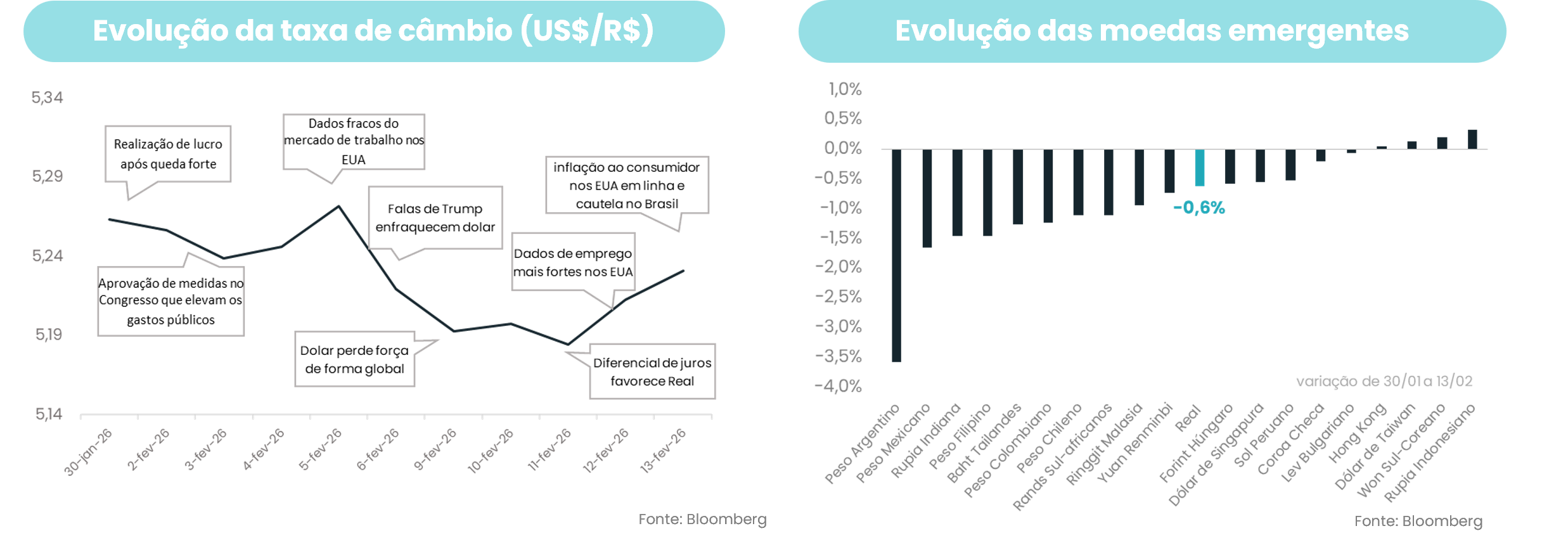 A semana foi marcada por valorização do real frente ao dólar, sustentada principalmente pelo forte fluxo estrangeiro para ativos domésticos, com destaque para a bolsa brasileira que atingiu níveis recordes e teve elevada entrada de capital financeiro. Esse movimento foi favorecido pelo diferencial de juros, que mantém o real atrativo. Ainda assim, o câmbio apresentou momentos pontuais de correção e maior volatilidade, refletindo a cautela com dados recentes de inflação no Brasil e indicadores de emprego e de preços nos Estados Unidos, que influenciam as expectativas sobre os próximos passos do Fed. Em linhas gerais, a taxa de câmbio permaneceu relativamente resiliente e com viés favorável ao real, embora ainda sensível ao cenário externo e à dinâmica do fluxo financeiro.