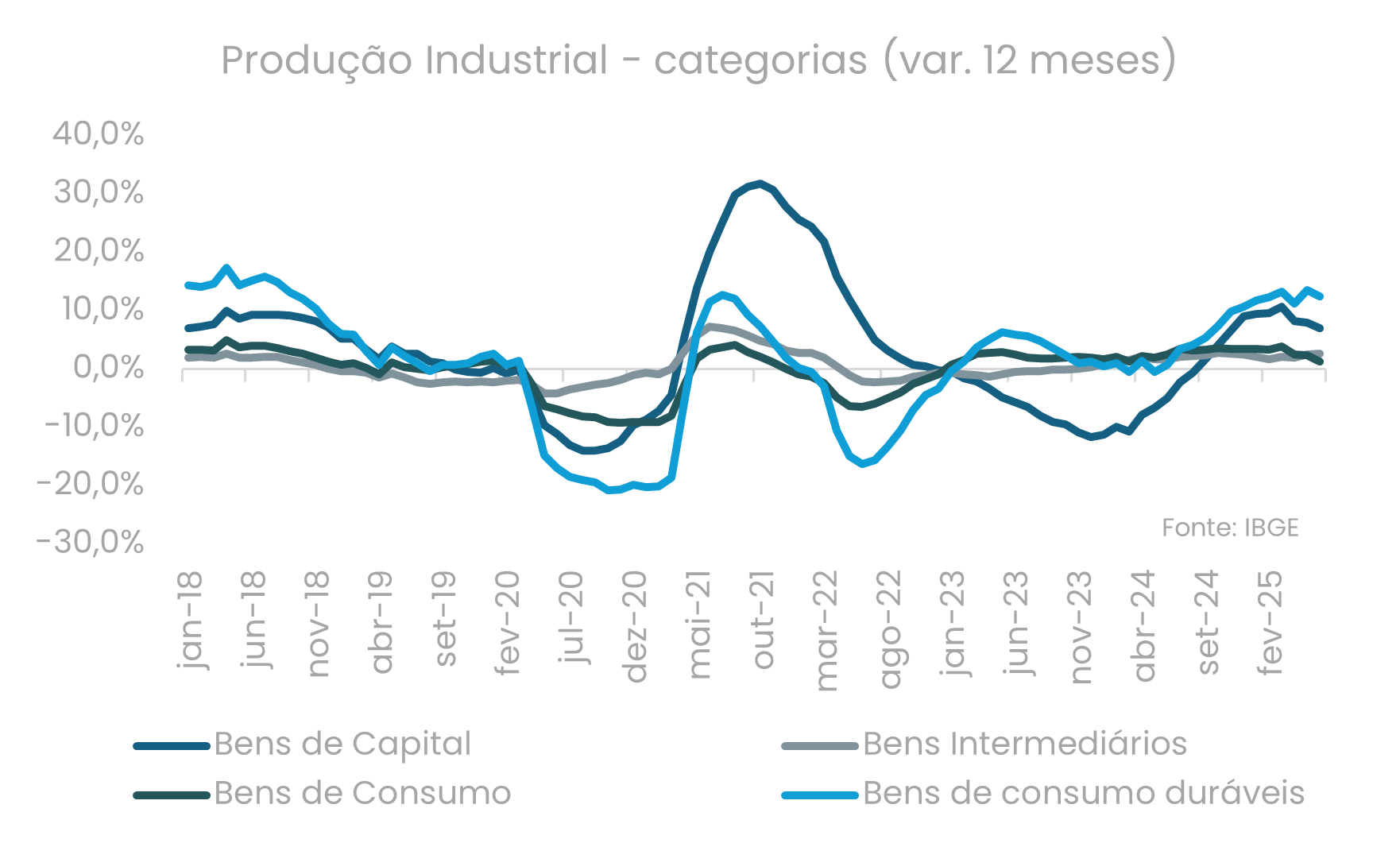 Começando por um dos ingrediente mais amargo da nossa receita, a indústria, o setor que sofre com os juros elevados e o crédito caro. Os dados mais recentes mostram um setor que ainda não encontrou tração para um ciclo de crescimento consistente. Até tivemos alguns avanços pontuais em segmentos ligados a bens de capital, sugerindo algum otimismo em relação a investimentos futuros, mas o desempenho segue desigual. A produção de bens de consumo duráveis (produtos fabricados para consumo final das famílias e que possuem vida útil prolongada), por exemplo, continua sensível ao custo do crédito, enquanto a de bens intermediários (utilizados como insumos na produção de outros bens ou serviços) sofre com a demanda global mais fraca (ver gráfico). Essa combinação faz com que o setor industrial, historicamente importante para o crescimento econômico como um todo, tenha um papel mais limitado na atual recuperação.