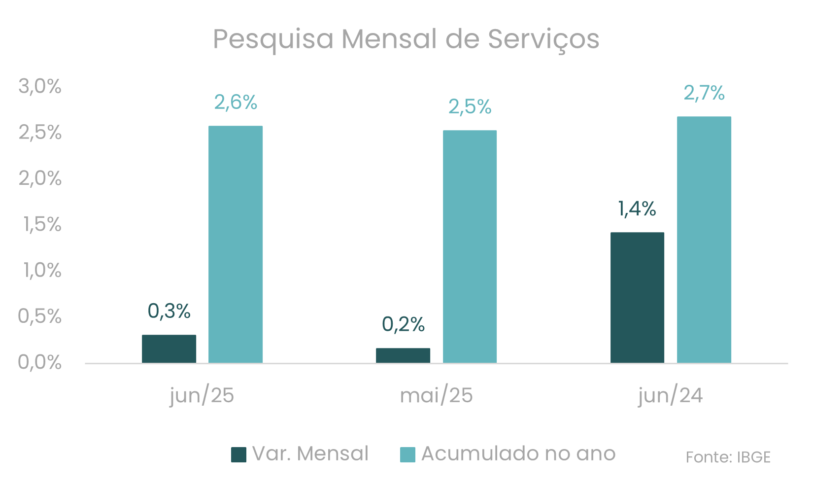 A calda de chocolate do nosso bolo, ou melhor, o setor de serviços - que representa mais de 70% do PIB- continua sendo o principal motor da economia brasileira – e, também, o ingrediente responsável por manter a inflação ainda acima da meta. Atividades ligadas à tecnologia da informação, serviços empresariais e turismo continuam mostrando expansão, embora com sinais de perda de ritmo em relação aos trimestres anteriores. Essa acomodação é natural após o forte crescimento observado no pós-pandemia (quem não enjoa de comer chocolate todo dia, não é mesmo? – eu não!), mas ainda mantém os serviços em terreno positivo e com peso suficiente para sustentar o nível de atividade (ver gráfico), compensando parcialmente nosso ingrediente mais insosso, a indústria.