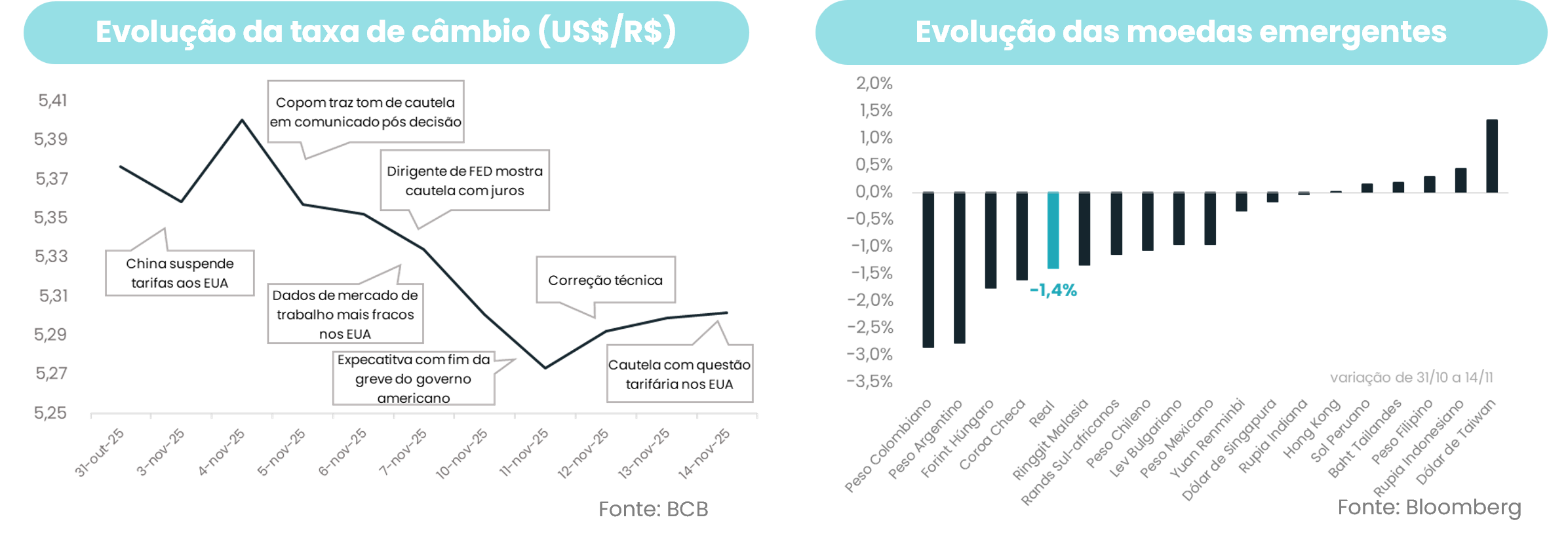O período foi marcado por forte apreciação da nossa moeda, que passou de uma cotação de quase US$/R$ 5,40 para algo em torno de US$/R$ 5,29 – uma valorização de mais de 1,5% em duas semanas. Entre os motivos para essa melhora, podemos destacar: 1. o fim da mais longa paralisação da história do governo dos Estados Unidos, que trouxe maior apetite ao risco para os mercados de forma geral; 2. o tom ainda cauteloso do Banco Central do Brasil na ata do Copom, sinalizando que Selic ficará em 15% por um período longo ainda – o que favorece o ingresso de fluxo de capital especulativo para o Brasil e 3. a expectativa de avanço comercial entre EUA e Brasil. Além da ausência de ruídos políticos internos – que sempre contribuem para reduzir as turbulências dos ativos brasileiros.
