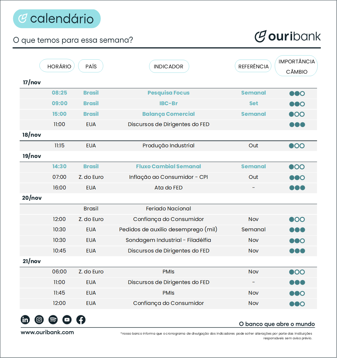 A curva de juros apresentou mais uma ligeira desaceleração em relação à semana anterior, respondendo ao resultado abaixo do esperado do IPCA de outubro. Além do índice cheio ter mostrado uma variação mais otimista, as medidas de núcleo também confirmaram o cenário de desinflação no Brasil. Contudo parece que esses resultados ainda não são totalmente suficientes para que o Banco Central inicie o ciclo de queda da Selic no curto prazo. O discurso da instituição continua tendo um viés mais cauteloso!
